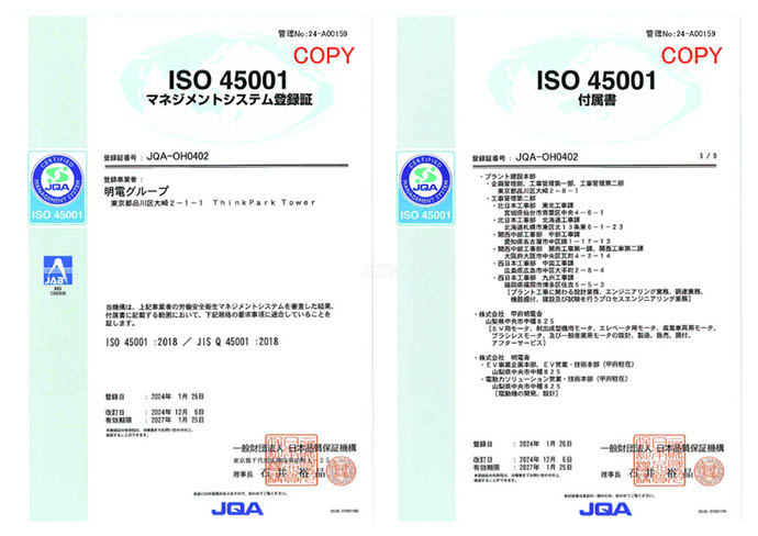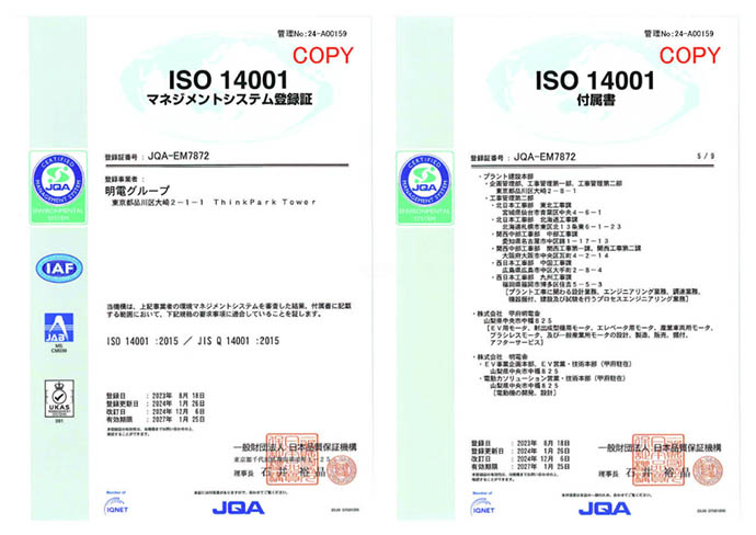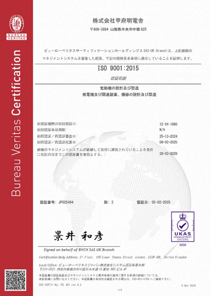 甲府明電舎は、製造している製品の品質は勿論のこと、製造ラインの信頼性及び安全性・環境への影響など各種国際認証機関の認定を受けることにより、世界標準の企業として邁進していきます。
